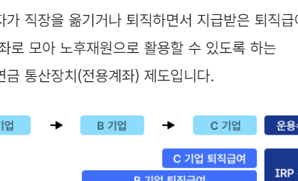답변2 IRP 계좌로 불리는 것이 바로 이것입니다. 근로자가 직장을 옮기거나 중간에 퇴직을 하게 되면서 받는 퇴직금을 한군데 모아두는 것입니다. 55세 이전에 퇴직할 경우 이 계좌를 이용한다면 퇴직금을 모아 노후에 사용할 수 있는 것은 물론 한번에 큰 세금을 내지 않아도 됩니다.